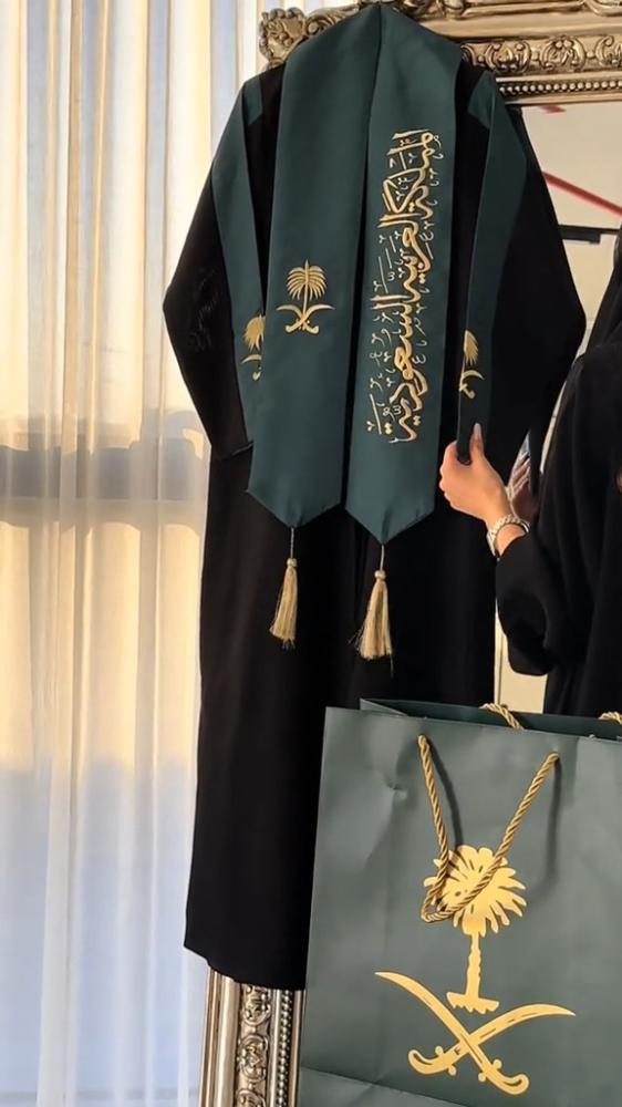 عباية سوداء مع وشاح أخضر مطرّز بخيوط ذهبية فاخرة.